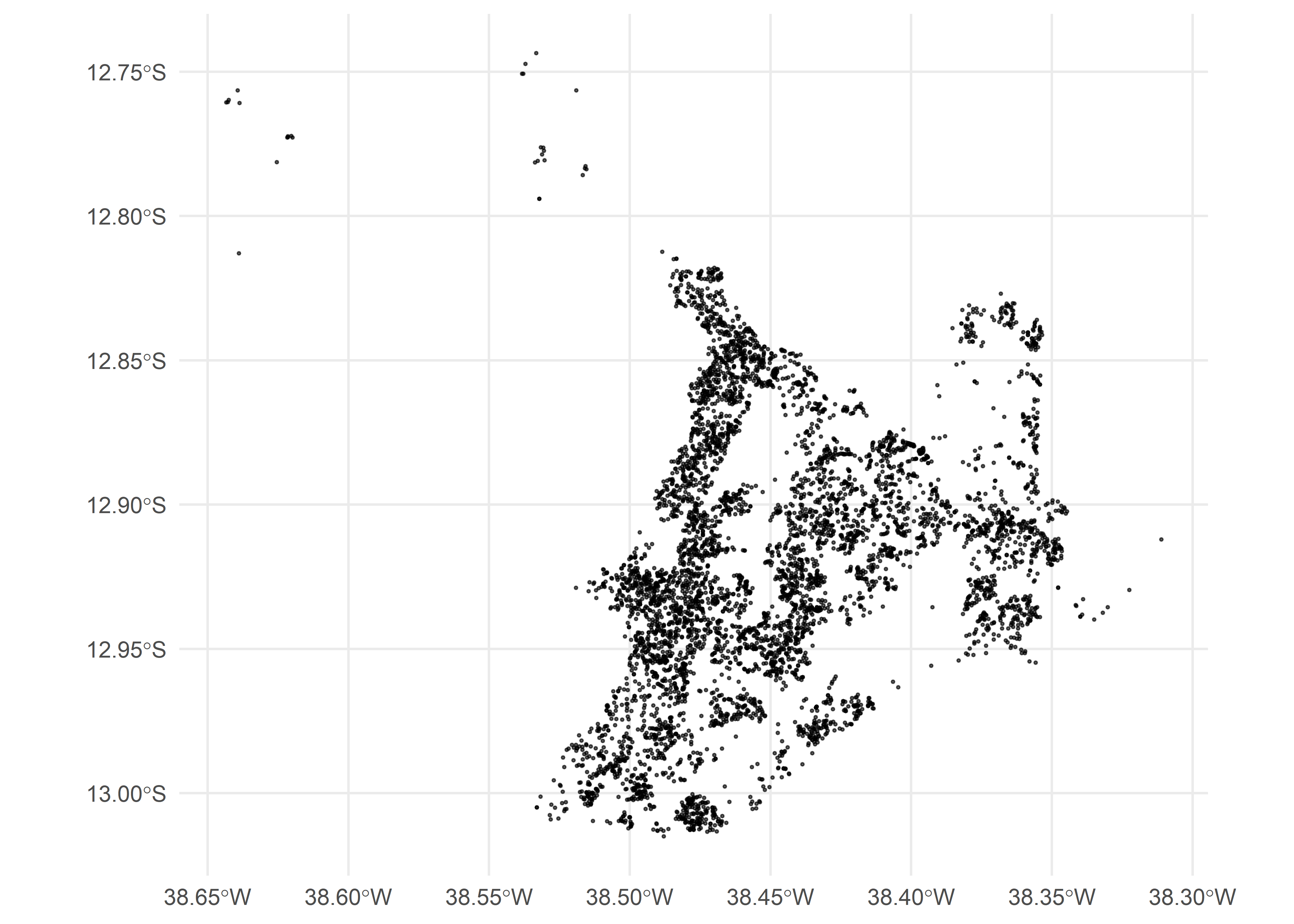 Warning: For large municipalities, CNEFE may contain more than 1 million address points. Plotting all coordinates at once can be slow and memory-intensive, so consider filtering or sampling before creating maps.