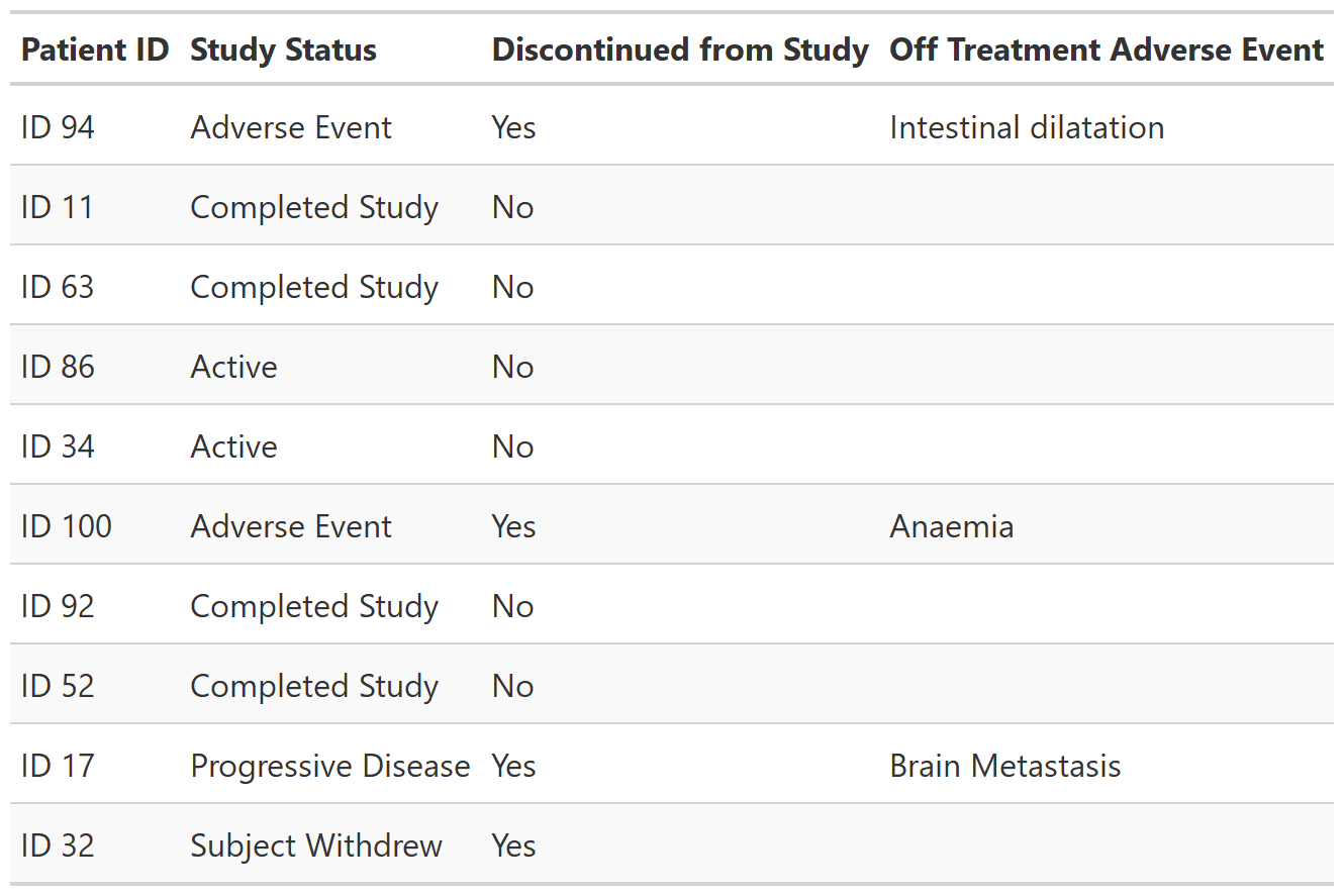 select(patient_id, status, discontinued, off_trt_ae) %>%