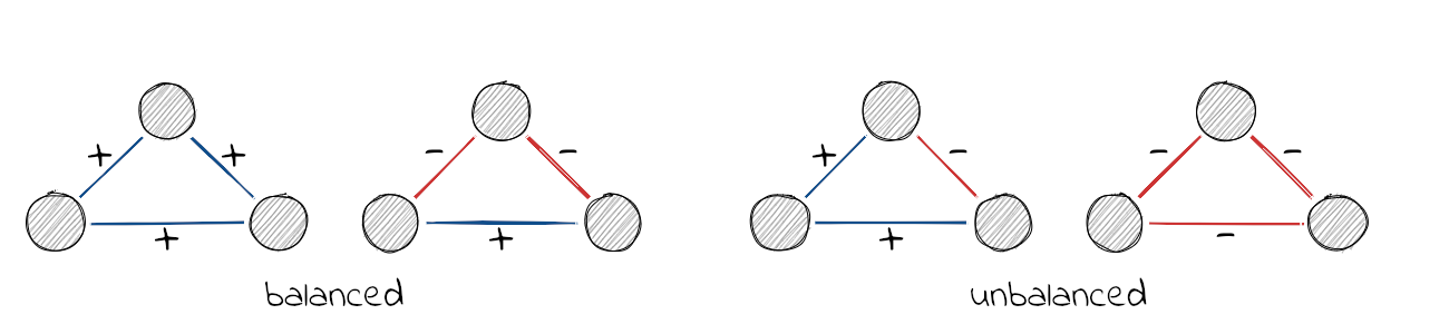 devtools::install_github("schochastics/signnet")The principles underlying structural balance are based on a theory in social psychology dating back to the work of Heider in the 1940s, which was generalized and extended to graphs by Cartwright and Harary in the 1950s. In its simplest form, it is defined via triangles. A triangle is balanced if all ties are positive (“the friend of a friend is a friend”) or only one tie is positive (“the enemy of my enemy is my friend”). The remaining configurations are said to be unbalanced.