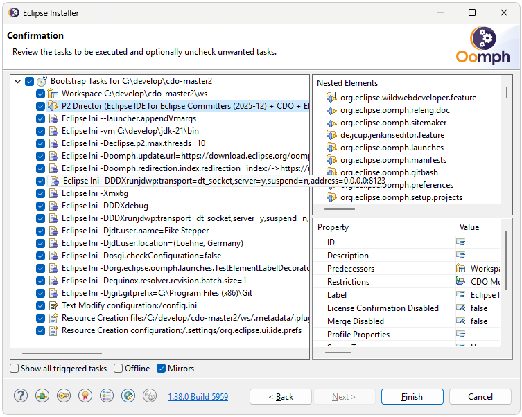 The installer will download and install the required Eclipse IDE packages, CDO, and all its dependencies. This may take a while depending on your internet connection speed. Once the installation is complete, the installer will launch the new IDE. Each time the IDE is started, it will check for updates and perform them automatically. Please refer to the Eclipse Installer documentation for details.