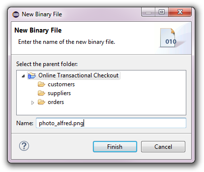 A new binary file can be created by opening the context menu on a checkout or on an existing folder under a checkout and then selecting New -> Binary File. The following dialog will pop up to ask for the name of the new binary file: