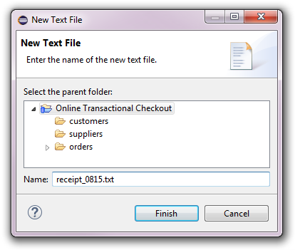 A new text file can be created by opening the context menu on a checkout or on an existing folder under a checkout and then selecting New -> Text File. The following dialog will pop up to ask for the name of the new text file: